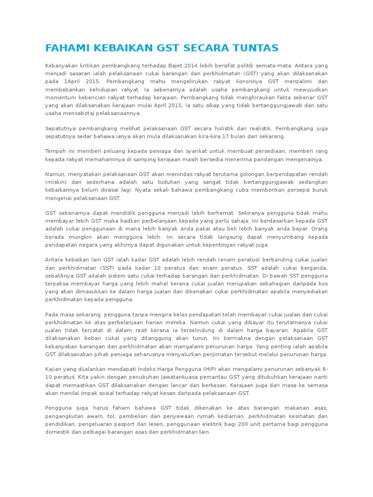Ahli ekonomi beranggapan bahawa pelaksanaan gst akan memberikan kesan yang paling minima ke atas kadar inflasi negara sekiranya ia dilaksanakan ketika tempoh keadaan ekonomi yang bergerak perlahan. Gst bukanlah kitab yang tidak boleh diubah demi kebaikkan rakyat. Impak gst terhadap ekonomi domestik sebenarnya sangat besar. Mustahil seorang ahli parlimen bn, tidak memahami kebaikan gst terhadap rakyat dan ekonomi negara. Beranda / ekonomi sma x.