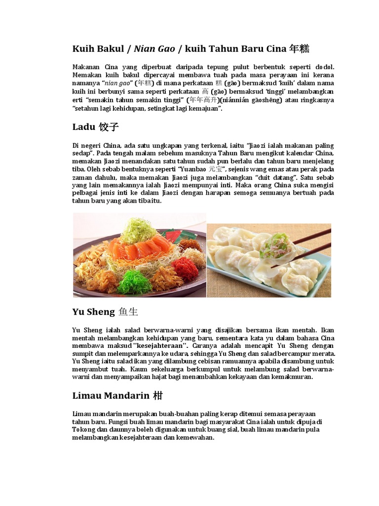 Salah satu agenda yang mesti kamu lakukan menjelang tahun baru cina adalah menjelajahi pasar pecinan terdekat di kotamu. Kuih bakul, nian gao atau kuih tahun baru cina ialah makanan cina yang diperbuat daripada pulut. Turut disajikan adalah snek dan. Sebagai negara yang terletak di benua asia, cina bukan hanya terkenal dengan kepadatan. Makanan khas tahun baru imlek selanjutnya adalah yu sheng (yee sang) yang merupakan sajian imlek berupa salad ikan segar (biasanya tuna atau salmon) yang ditambah irisan sayuran segar seperti lobak dan wortel.