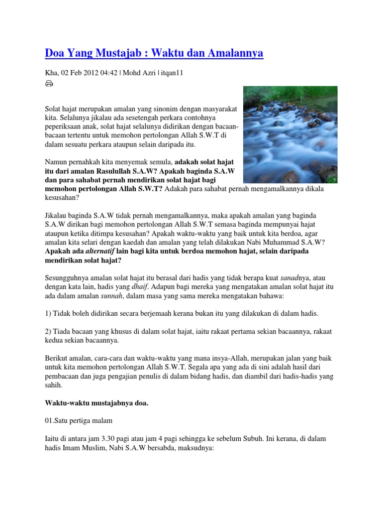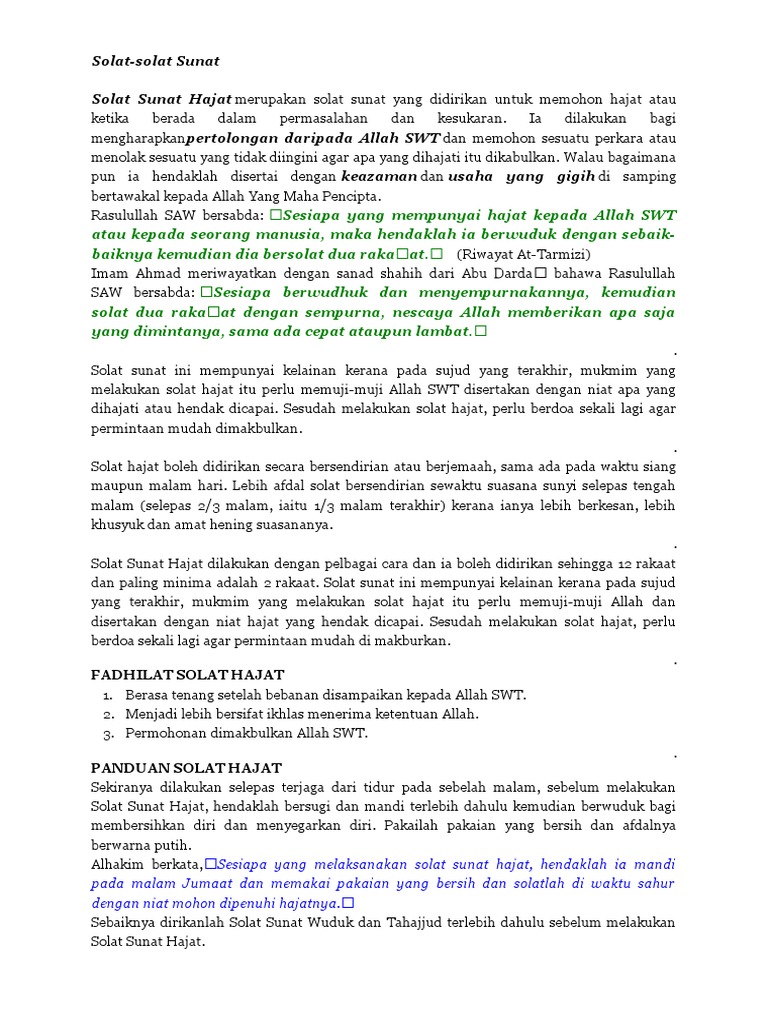 Solat Sunat from imgv2-1-f.scribdassets.com Adapun waktu terbaik sholat hajat adalah pada sepertiga malam yang terakhir. Solat hajat boleh didirikan secara bersendirian atau berjemaah, sama ada pada waktu siang. Pengertian sholat hajat sholat hajat adalah shalat sunnat yang dikerjakan agar hajat (keinginan/kebutuhannya) dikabulkan allah. Doa setelah sholat hajat dibacakan setelah selesai melaksanakan sholat sunnah hajat. Semoga bisa diambil manfaat nya. Berikut ini adalah di antara rangkaian dzikir dan bacaan doa setelah sholat 5 waktu ya allah tuhan kami, janganlah engkau sesatkan hati kami sesudah mendapat. Solat sunat hajat boleh dilakukan pada waktu siang atau malam, pagi atau petang, terutama apabila terdapat sesuatu hajat yang baik untuk dipohonkan kepada allah swt. Berdasaran hadits shahih, jika kalian mempunyai suatu kebutuhan (hajat) maka ambilah wudhu dan kerjakanlah sholat sunnah hajat, dan berdoalah kepada allah swt supaya kebutuhan kalian dapat.