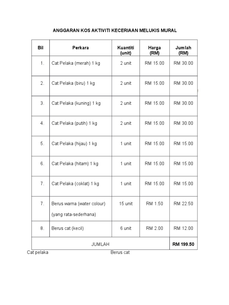 Anggaran Kos Mural from imgv2-1-f.scribdassets.com Cat avian,avian,foto cat avian,warna cat avian tembok 2020,varian cat avian,katalog warna avitex,katalog cat tembok avitex warna biru,katalog cat minyak hijau,katalog cat kayu avitex 1kg. Daripada berus gigi (enam unit), berus cat (dua) dan berus solekan (satu set) yang diuji, didapati berus cat mencatatkan lebih 70 peratus daripada bulu haiwan. Berus adalah keperluan pada kebanyakan pekerjaan cat untuk keupayaan mereka untuk mencapai sudut yang ketat dan memotong sepanjang trim. Harga cat besi di atas tampaknya banyak mengalami perubahan. Facebook gives people the power to share and makes the. Kalau upah cat pon, harga upah beza2. Temukan daftar harga cat terbaru dan terlengkap untuk semua merek dan warna cat beserta tips dan trik memilih cat untuk rumah anda! Berus cat iv is on facebook.
