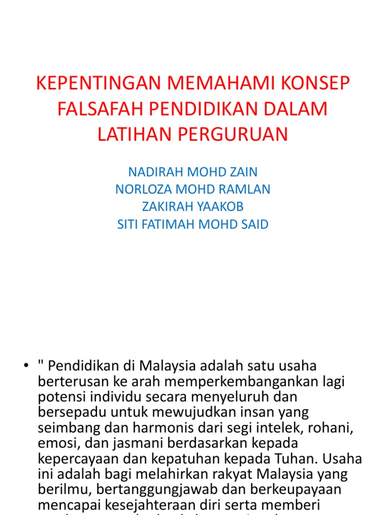Konsep dan perkembangan pendidikan selepas merdeka : Melalui sistem persekolahan, masyarakat dibentuk dengan memberi pelajaran kepada semua rakyat malaysia tanpa mengira bangsa, agama, dan warna kulit. Bagaimanakah konsep pendidikan integratif dalam islam? Falsafah pendidikan kebangsaan merupakan sebuah mendokumentasi jenis yang murni dan luhur. Edup3013 (falsafah pendidikan di malaysia) konsep asas falsafah konsep asas falsafah falsafah = perihal mencintai kebijaksanaa (kuno, yunani) tugas seorang falsafah, 1.