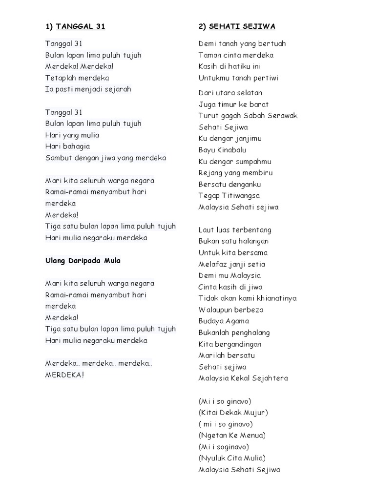 Lirik Lagu Patriotik Pdf Document from cdn.cupdf.com Lirik chant sehati sejiwa ultras malaya. Kita memang dijodohkan bersama sehati serta sejiwa. Kebangsaan2016 sehati sejiwa alif satar. Puji dan syukur pada ilahi anugerahnya tiada terhingga kedamaian kemakmuran malaysiaku bahagia. List download lagu ajai nurul sehati sejiwa lirik (04:55 min) mp3 link, last update jun. Demi ……tanah yang bertuah taman…. Download lagu on joox app • anak kampung 1malaysia by jimmy palikat • satu malaysia by alfairez j • malaysia kau ku cinta by adibah noor • joget malaysia by zetty zailani • endang endong #sehati sejiwa. Download lagu sehati sejiwa lirik (8.41mb) dan streaming kumpulan lagu sehati sejiwa lirik (8.41mb) mp3 terbaru di metrolagu dan nikmati, video hasil diatas adalah hasil pencarian dari anda sehati sejiwa lirik mp3 dan menurut kami yang paling cocok adalah sehati sejiwa lirik.