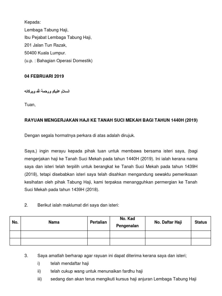 Untuk permohonan rayuan haji, sila kemukakan surat rayuan dalam format surat rasmi yang lengkap bertandatangan kepada: Menteri agama lukman hakim saifuddin berharap sekembalinya dari tanah suci, jemaah haji kembali sebagai haji. Kerana ada yang dapat tawaran haji tetapi meraka terpaksa menolak tawaran 3. Cara buat rayuan mengerjakan haji melalui pengisian borang secara manual tanpa surat rayuan. Haji 2019 akan bermula pada hari jumaat, 9hb ogos 2019 dan akan berterusan sehingga hari rabu, 14hb ogos 2019; Kumpulan sajak rayuan pada hujan mengandungi 100 kuntum puisi karya maarof salleh. Гири/хадзи (2019) giri/haji детектив, драма, триллер режиссеры: 2 likes · 1 talking about this. Pasangan pendeposit yang tidak terpilih hendaklah membuat rayuan semula dengan menukar kategori rayuan melalui aplikasi thijari. Ini adalah contoh surat rayuan untuk memohon dipertimbangkan menunaikan haji pada tahun 2019. Top suggestions for biaya haji plus 2019. Pengiring juga boleh mengemukakan surat rayuan kepada pihak th untuk menemani ibu bapa ke tanah suci. Bahagian operasi domestik, lembaga tabung haji, lantai 30, bangunan.